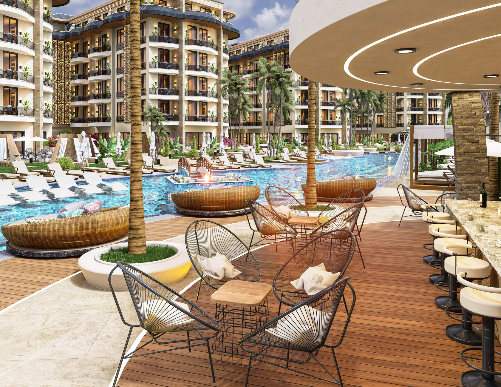 Инфраструктура комплекса: открытый бассейн (700 м²), джакузи, детский бассейн, подземная парковка, детская площадка, кинотеатр под открытым небом, зоны отдыха, место для занятия йогой, застекленная бесетка, конференц зал, коворкинг, библиотека, бильярд, настольный теннис, закрытый бассейн, турецкая баня, сауна, паровая, джакузи, тренажёрныйл зал, детская игровая комната, кафе. Особенности комплекса: шатл до моря, огороженная территория, охрана 7/24, Wi-Fi, спутниковое TV, подстветка территории и фасадов, электрогенератор Комплектация апартаментов: входная стальная дверь, видеодомофон, встроенная мебель на кухне и в ванных комнатах, встроенный шкаф в коридоре, полный пакет бытовой техники ( холодильник, посудомоечная машина, варочная поверхность, духовка, вытяжка, стиральная машина ), кондиционер в каждой комнате, подогрев полов в ванной комнате, душевые кабины, сантехника, электрический водонагреватель
